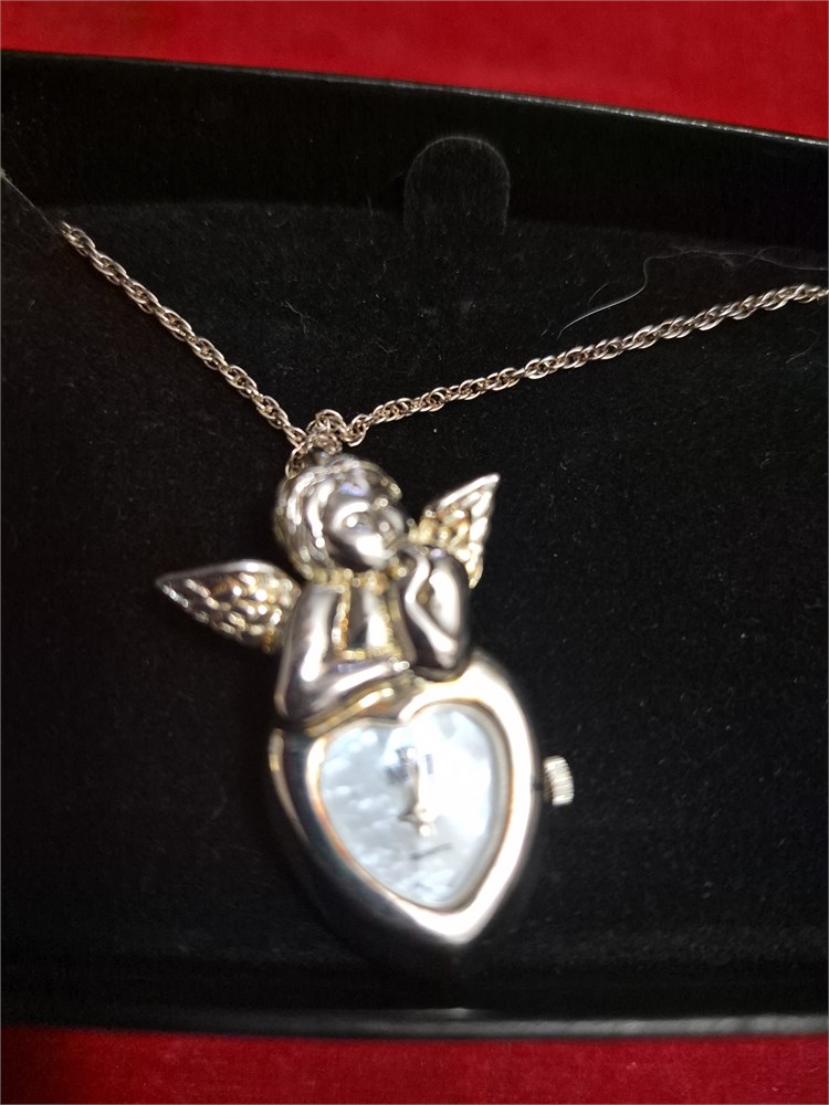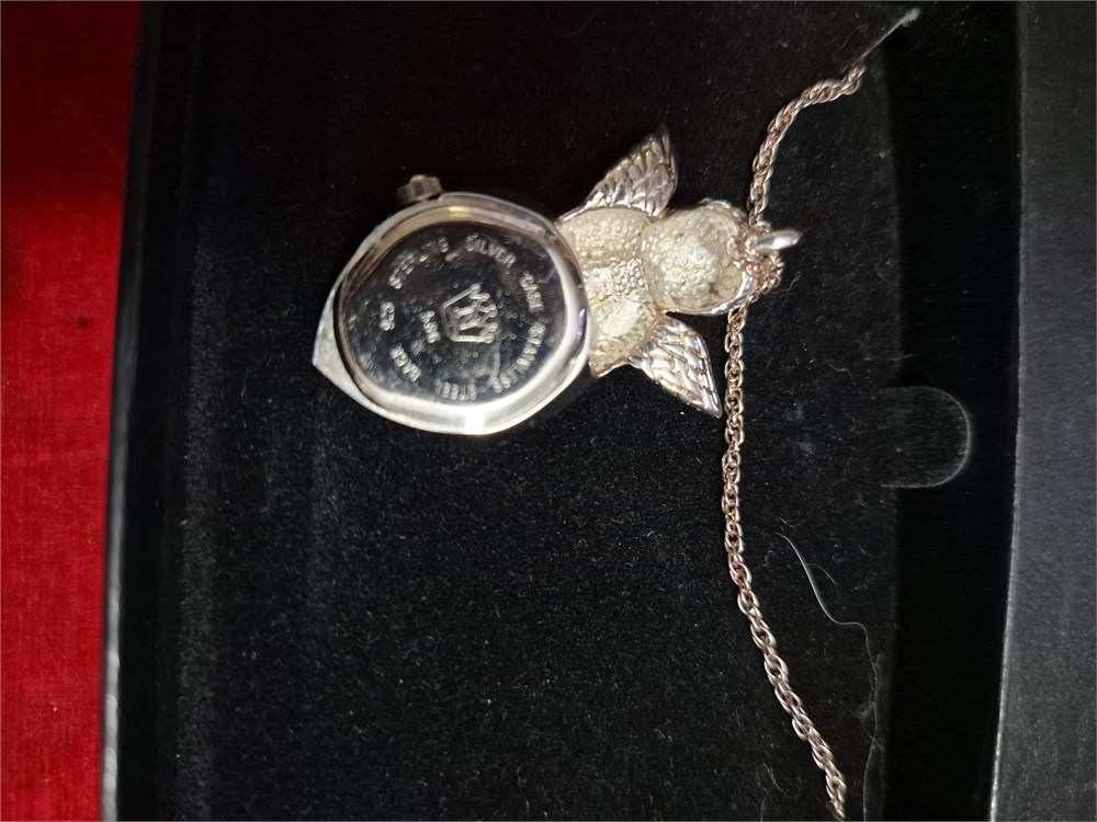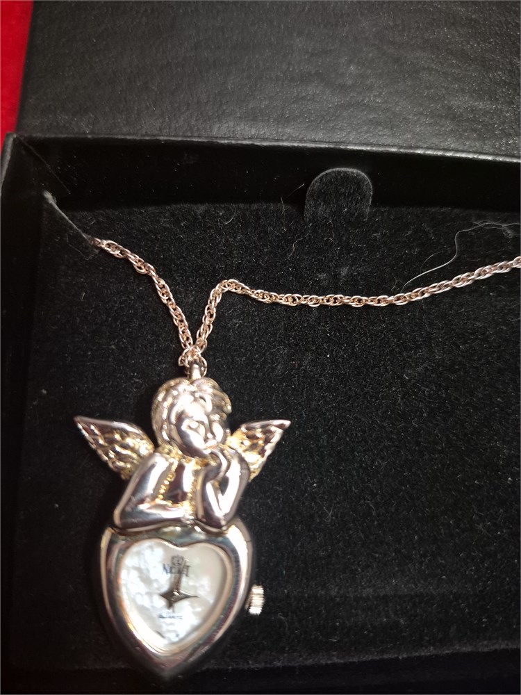 Nicolet Sterling Silver Angel Pendant Vintage Watch Necklace 925 Quartz. Case is sterling base is stainless.