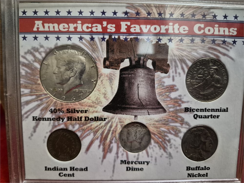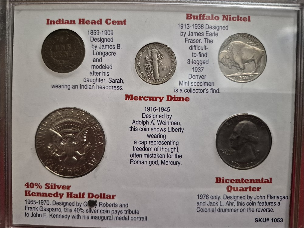 America's Fimest Coins 5 Coins set. Includes 1967 40% Silver Kennedy Half, 1976 Quarter, 1903 Indian Head Cent, 1935 Mercury dime and 1936 Buffalo Nickel.