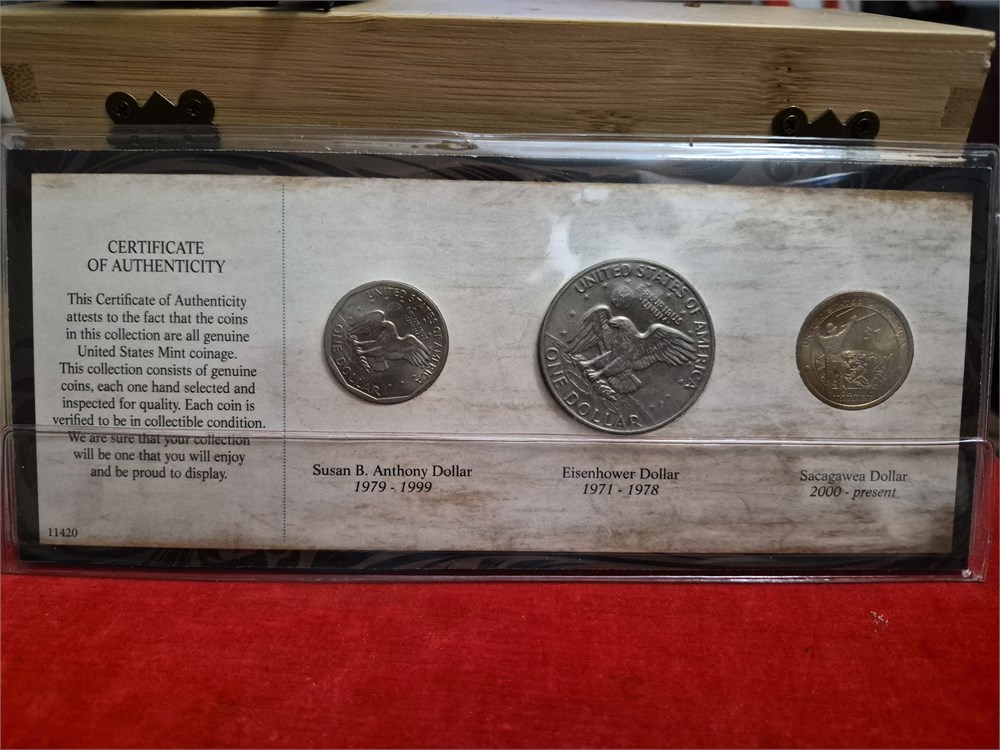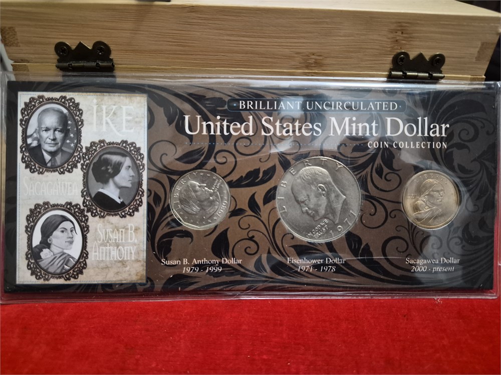 United States Mint Dollars. Includes 1977 Eisenhower Dollar, 1980 Susan B Anthony Dollar and Sacagawea Dollar. Sacagawea dollar has no mint year.