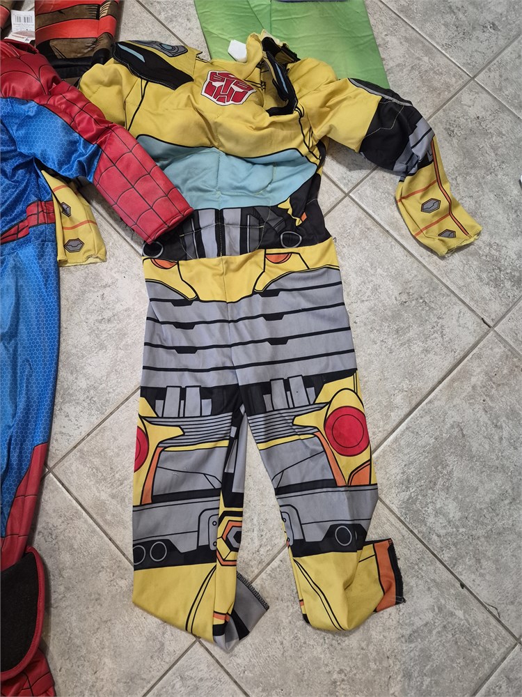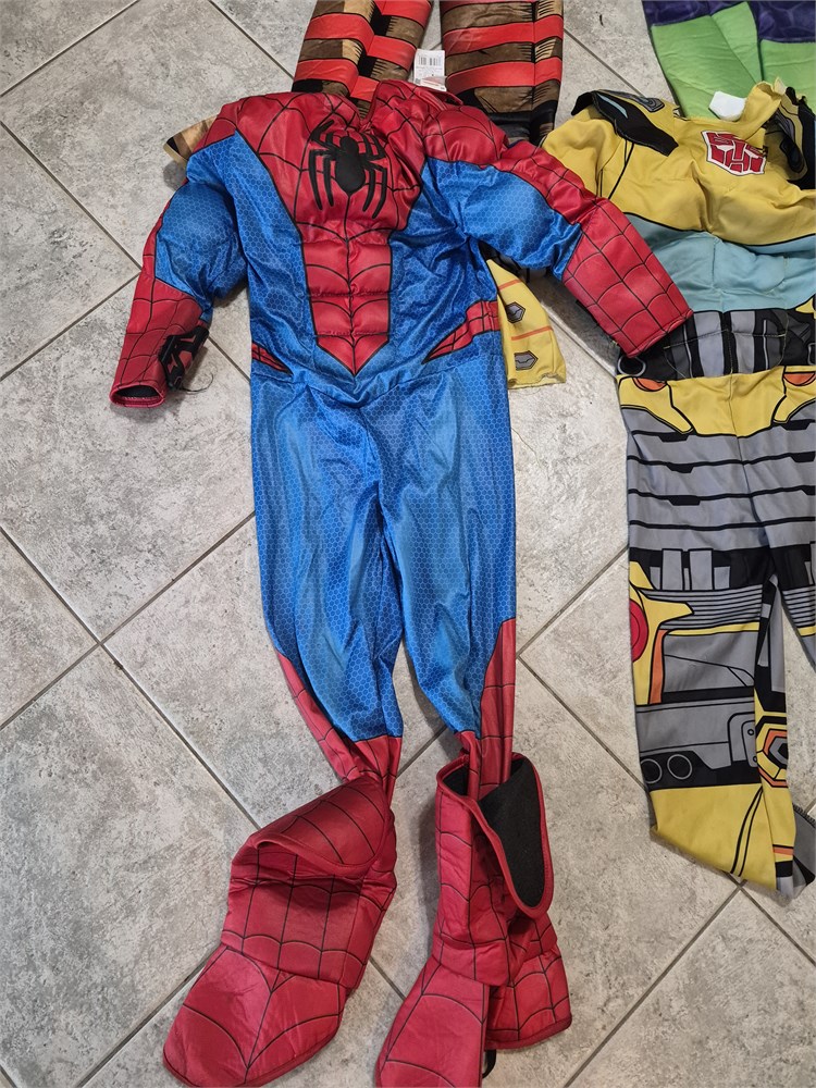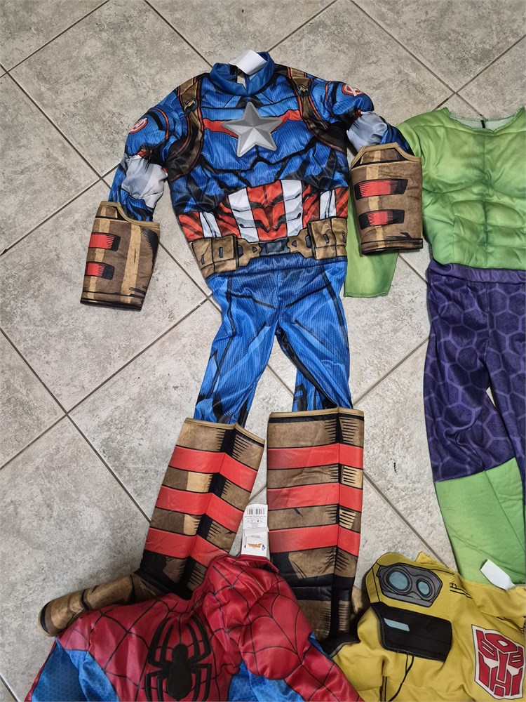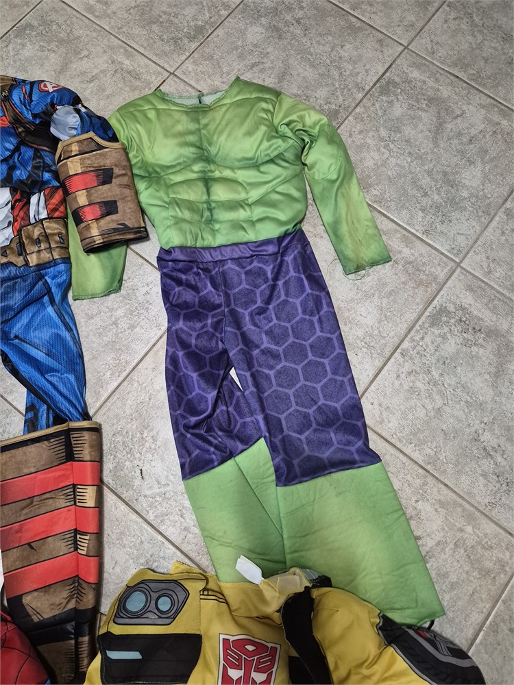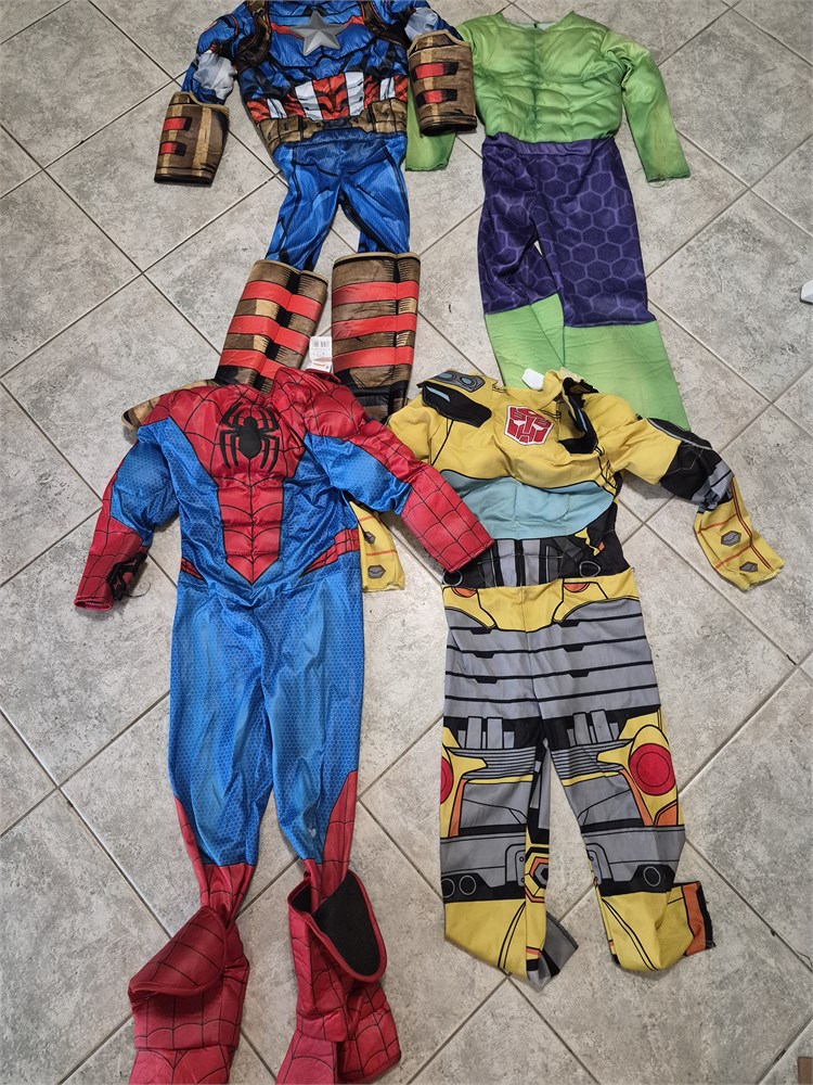 4 Kids Super Hero Costumes. These are body suit only and no masks. Includes Spiderman, Captain America, The Hilk and Bubble Bee.