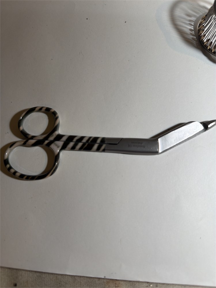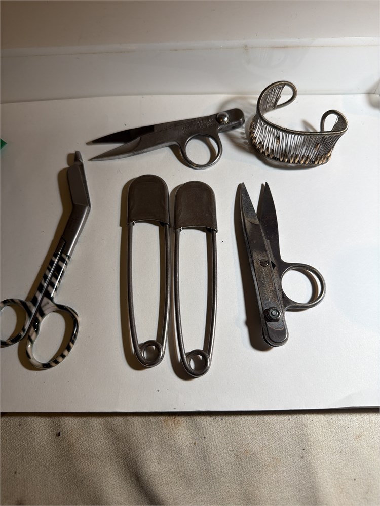 We have two vintage diaper pins two gold sealed scissors made in Florida one hair, cutting scissors Silvertone bracelet