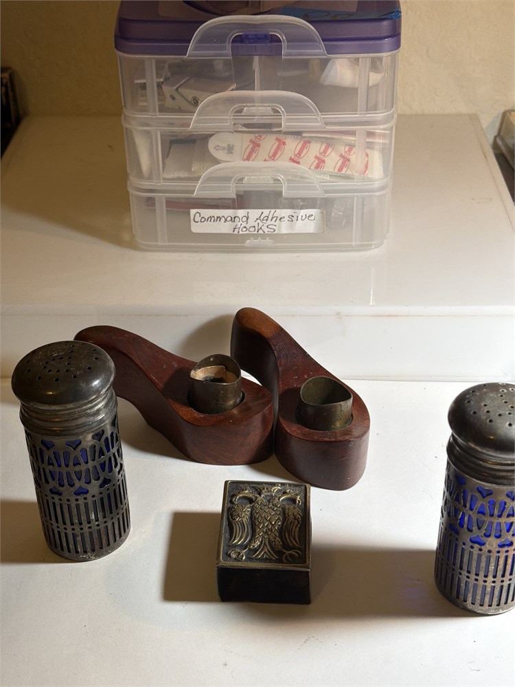 Wood canister holders, silver plate with purple Glass salt and pepper shaker vintage a box of adhesive hooks and napkin holder, Gold  tone
