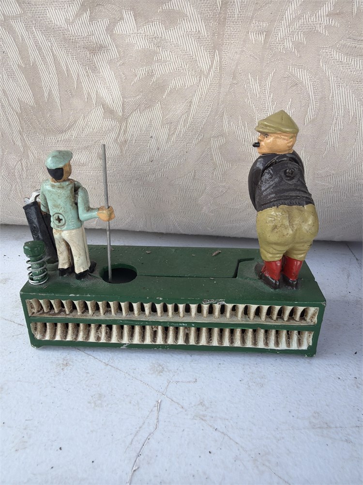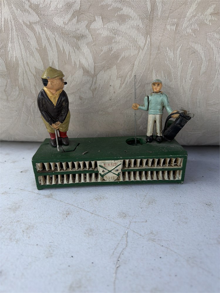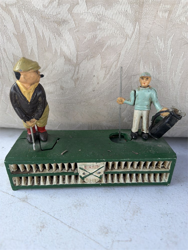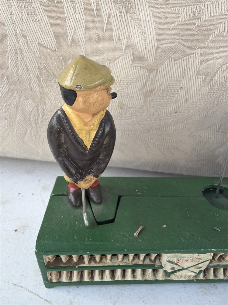 Vintage Cast Iron Mechanical Bank "Birdie Putt " Golfer And Caddy " Piggy Bank