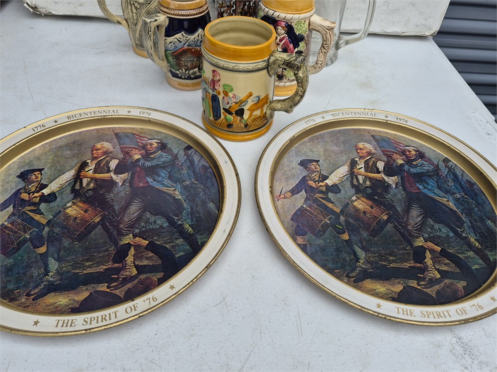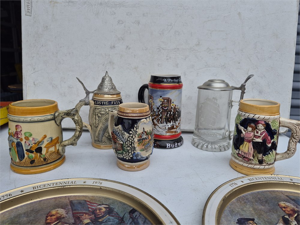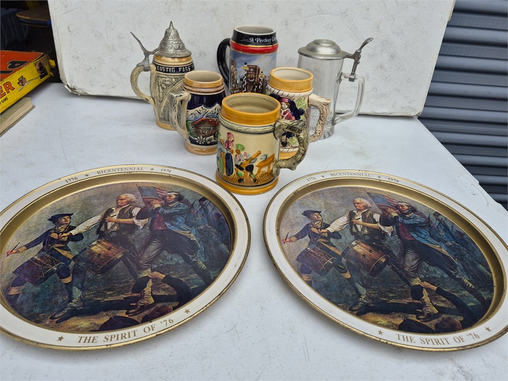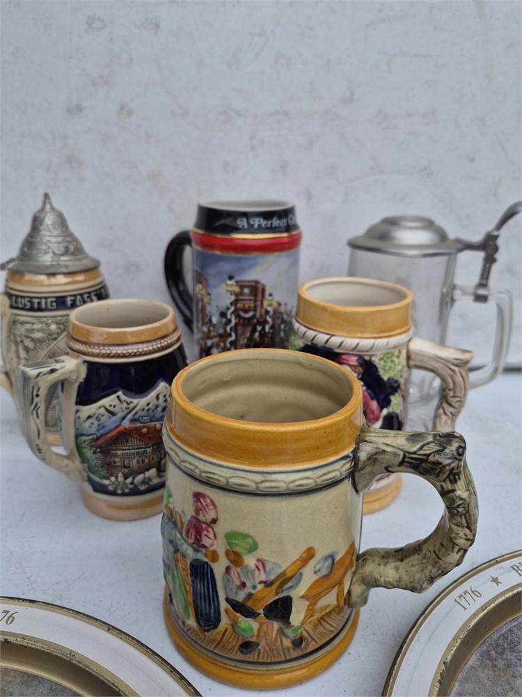 Nice collectibles bar ware lot. Includes 6 Steins and two metal server trays.