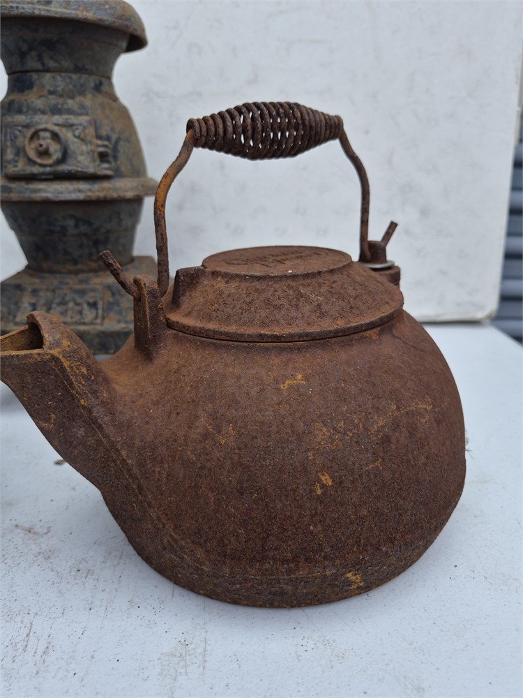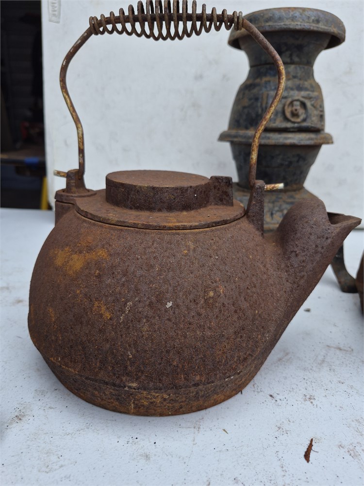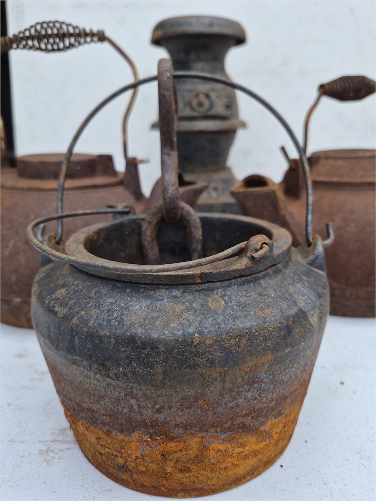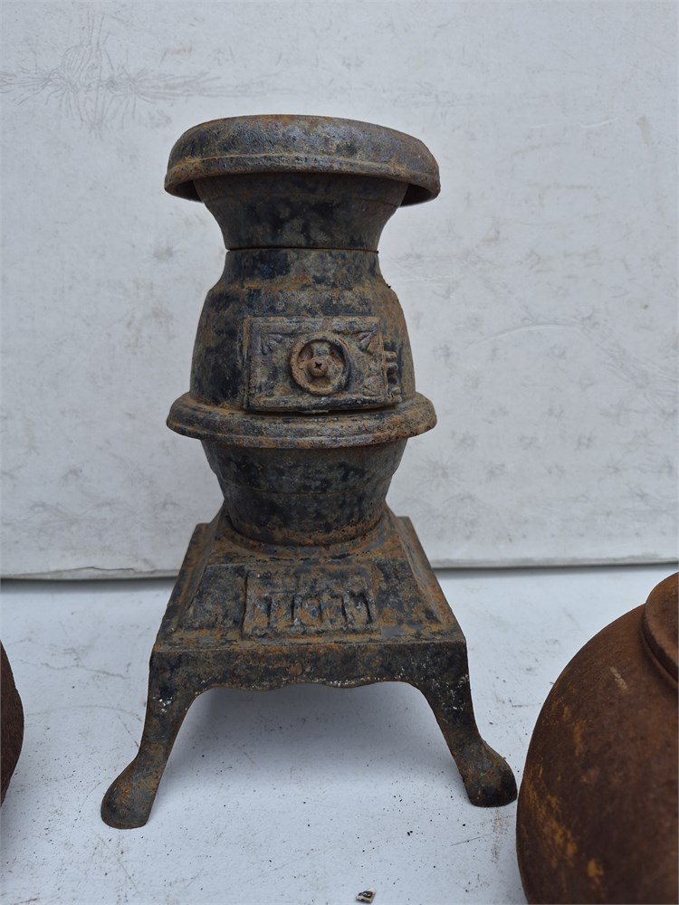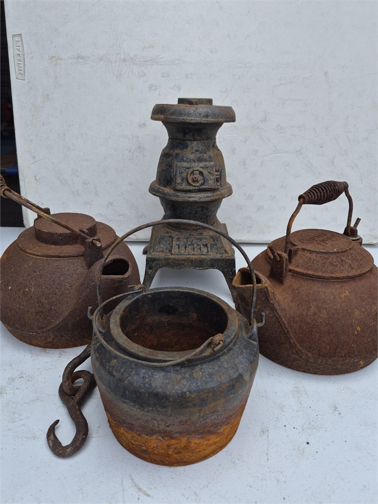 Lotte of four vintage cast iron pieces includes small stove, two pots and one additional peace.