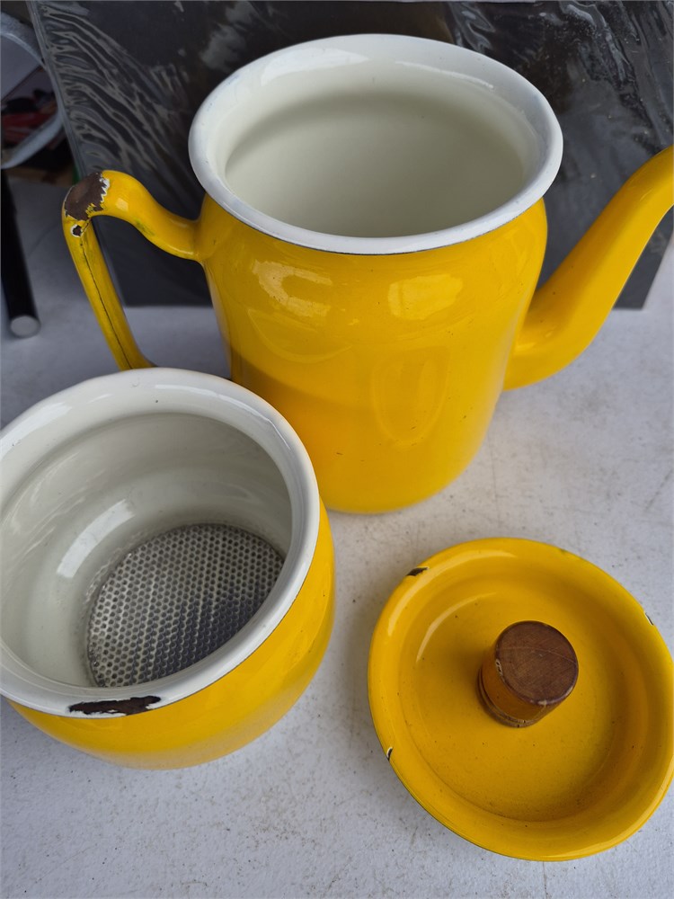 Vintage 1960s Enamelware Coffee Maker: Sunshine Golden Yellow. There are some areas of missing enamel.