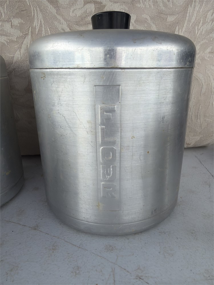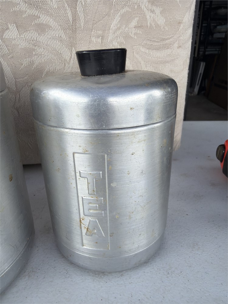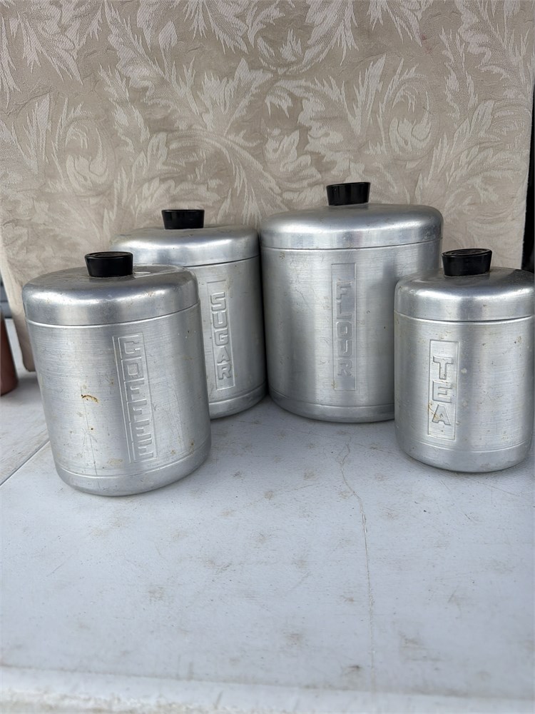 Assortment of canisters, aluminum century, aluminum ware, made in USA, flour, sugar, coffee, and tea all very vintage