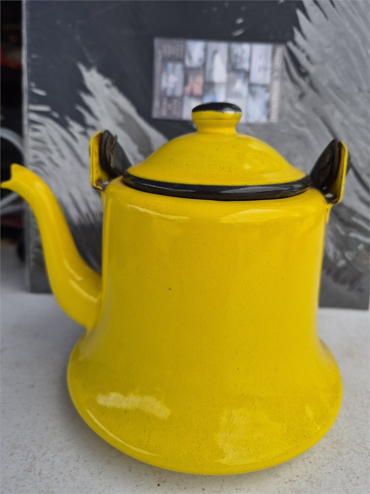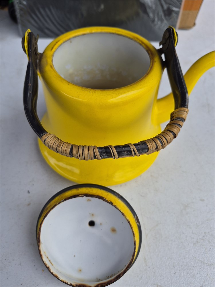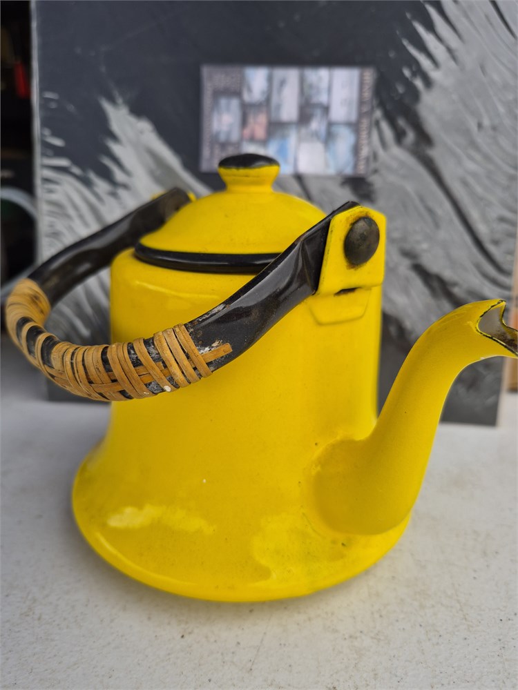 Vintage yellow and black enamel teapot kettle with handle and lid Japan.