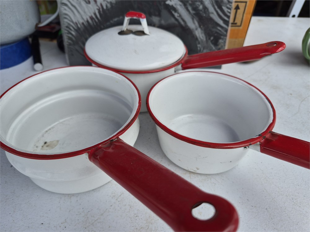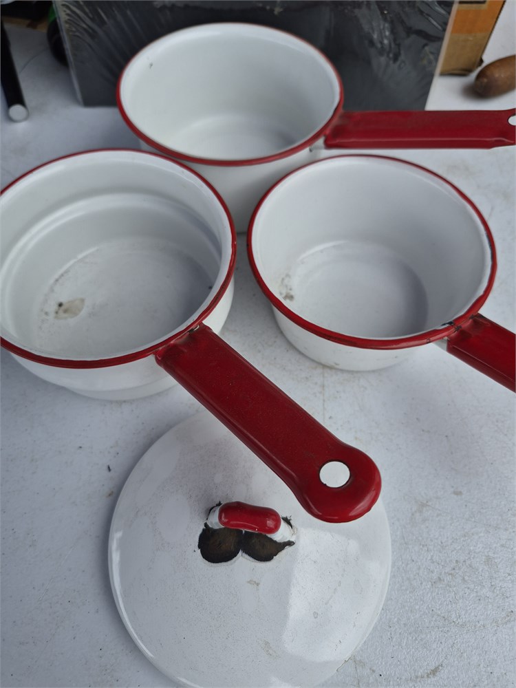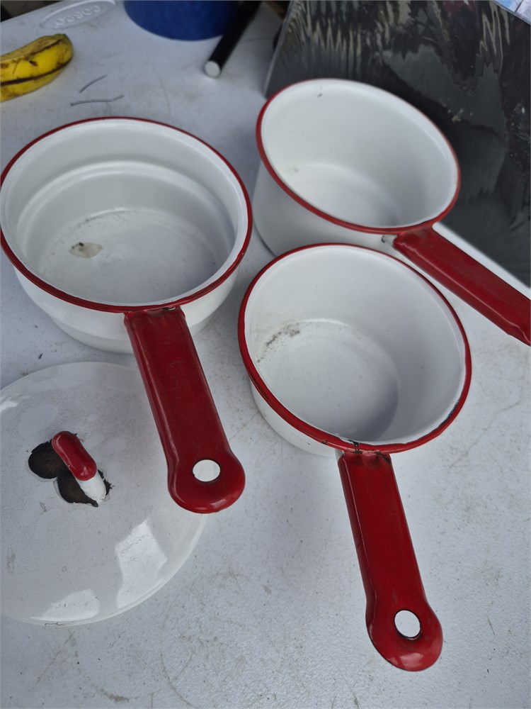4 piece Vintage WHITE PORCELAIN ENAMELWARE red Rim pans Rustic Farm. The lid fits two pans.