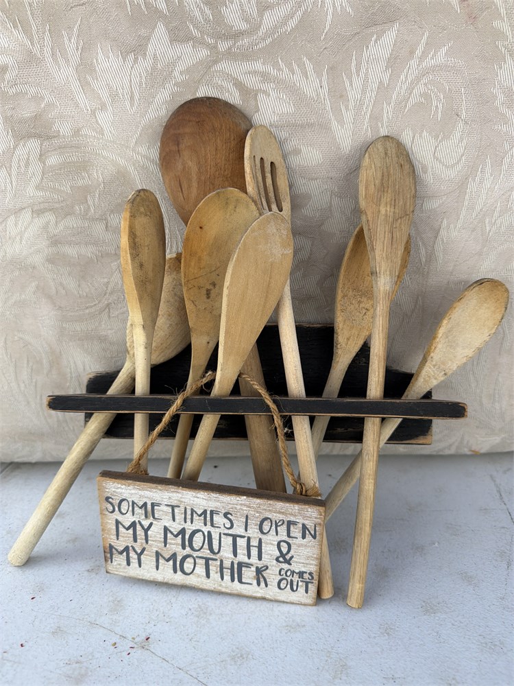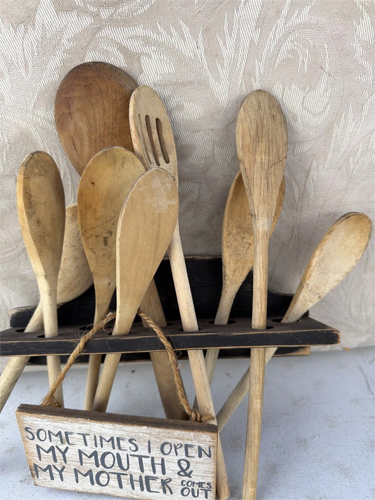 Nine vintage spoons with wall rack