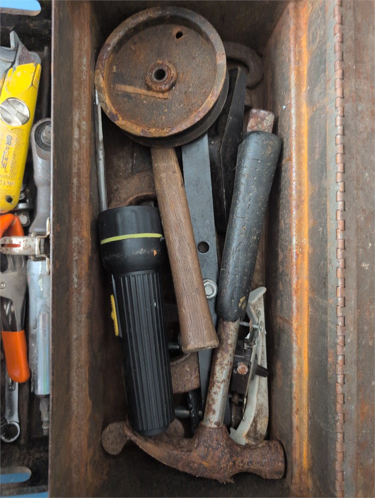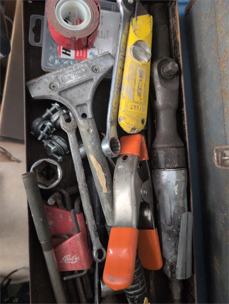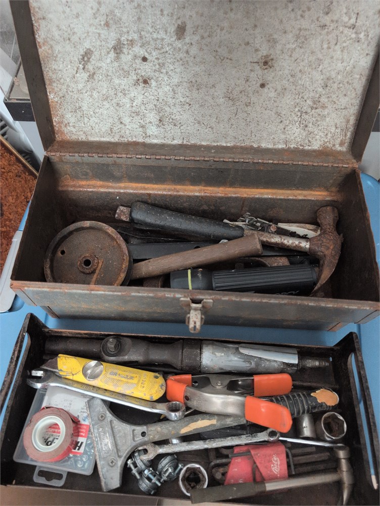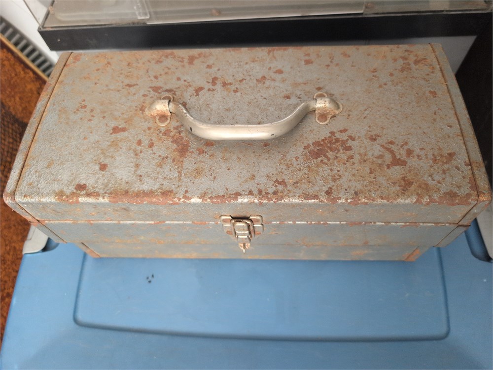 Vintage metal tool box, filled with tools(D)