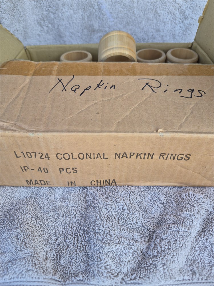 Nice box of wood napkin rings.There are forty plus included in this box.