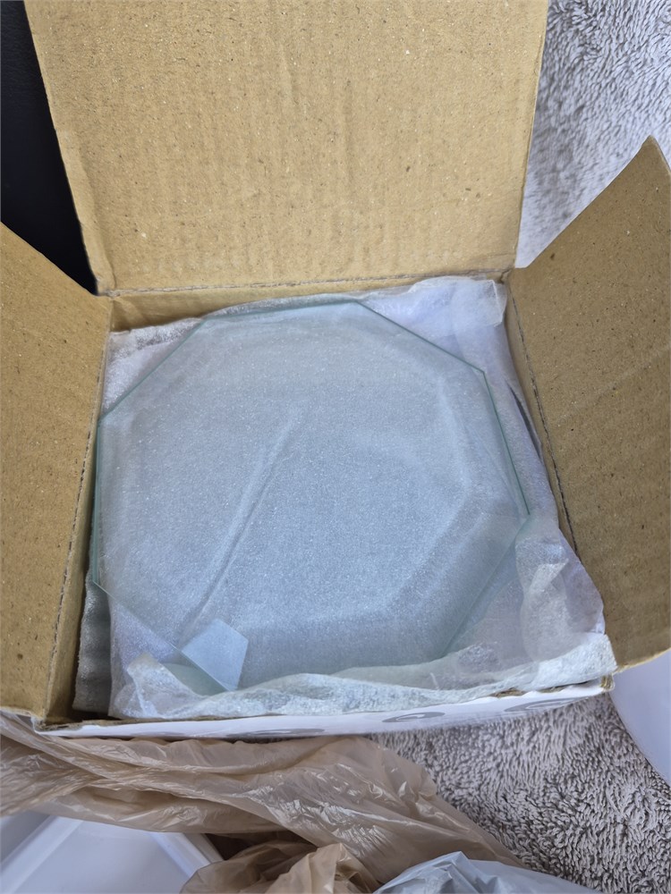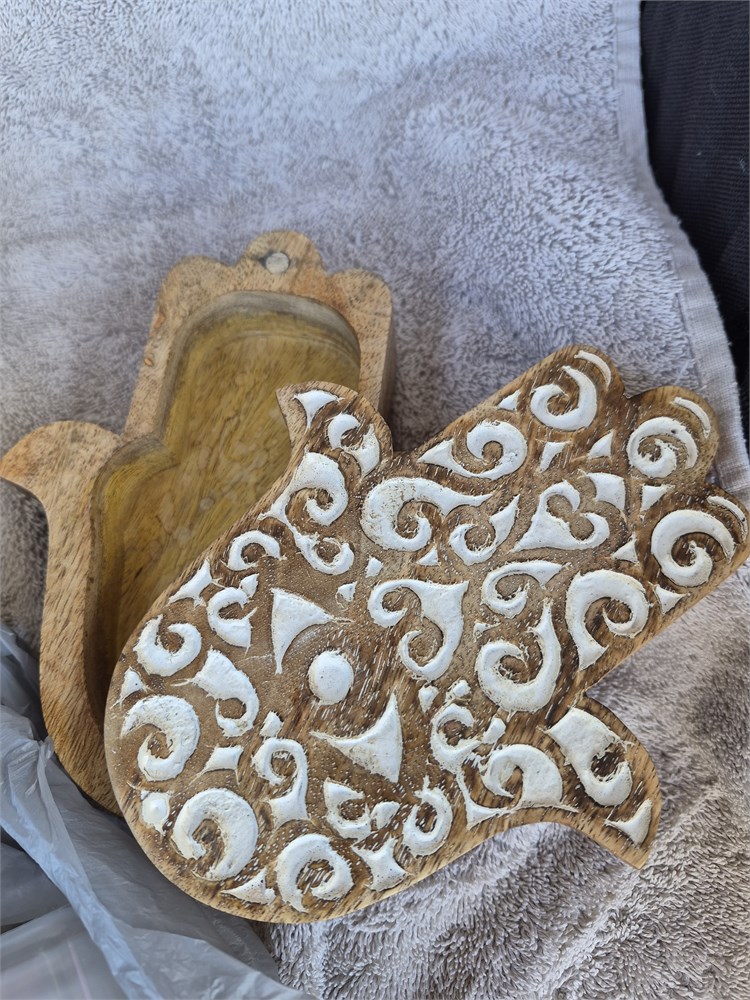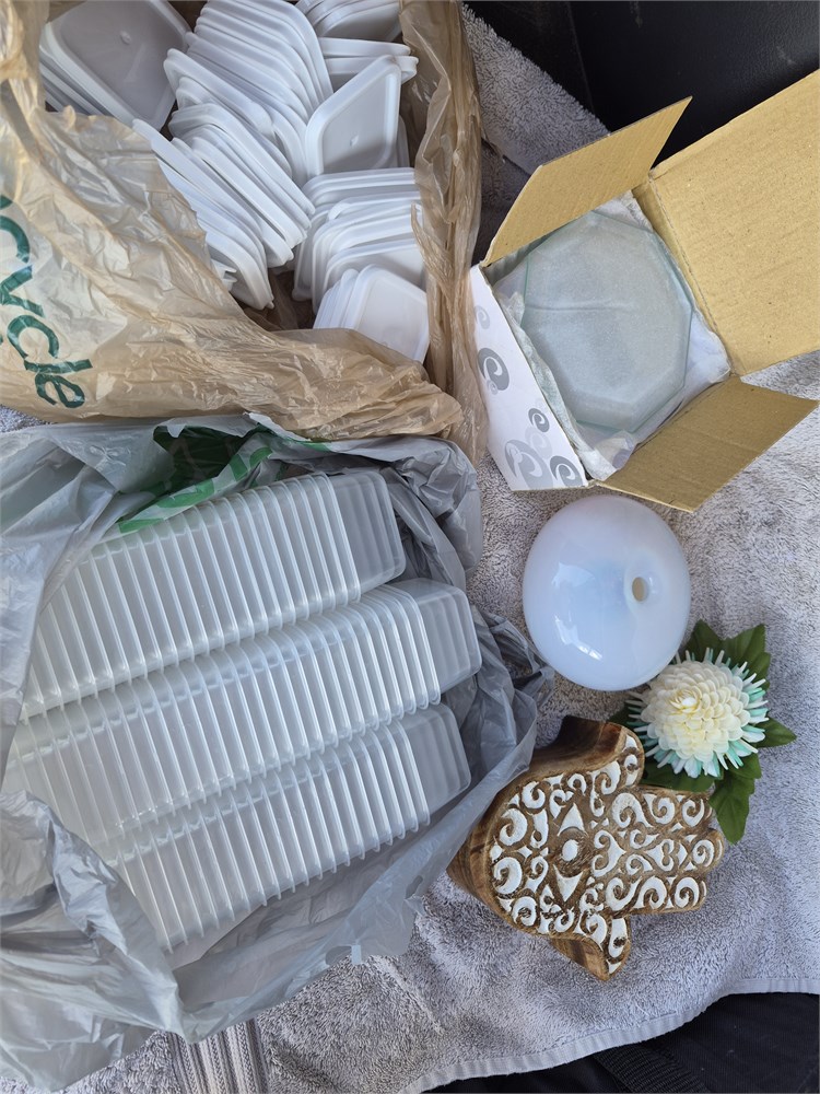 Lot of useful items includes a new box of glass coasters.A little hand shaped trinket box that slides open an almost iridescent paperweight, and several small containers with lids.