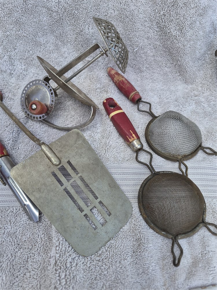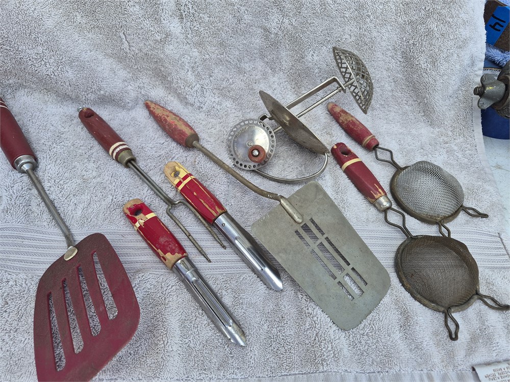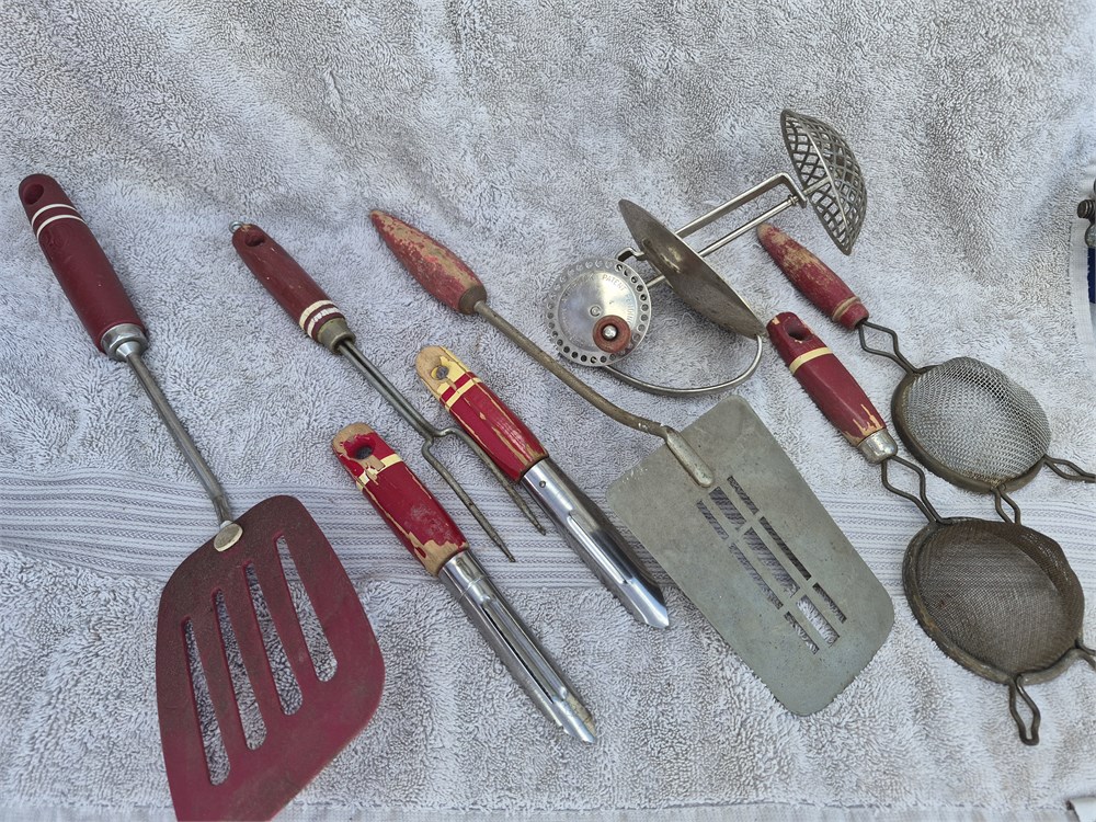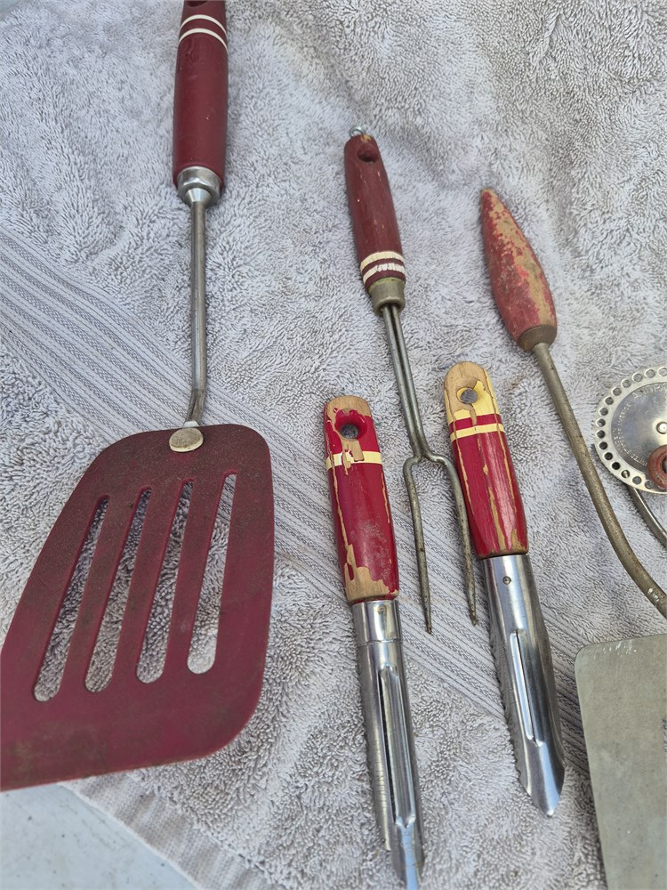 Vintage lot of red Handled kitchen utensils. All are made in USA. MIXER is by Androck.
