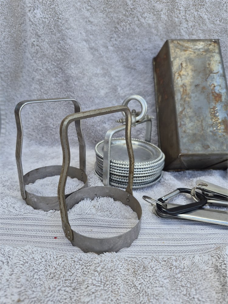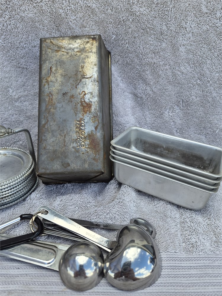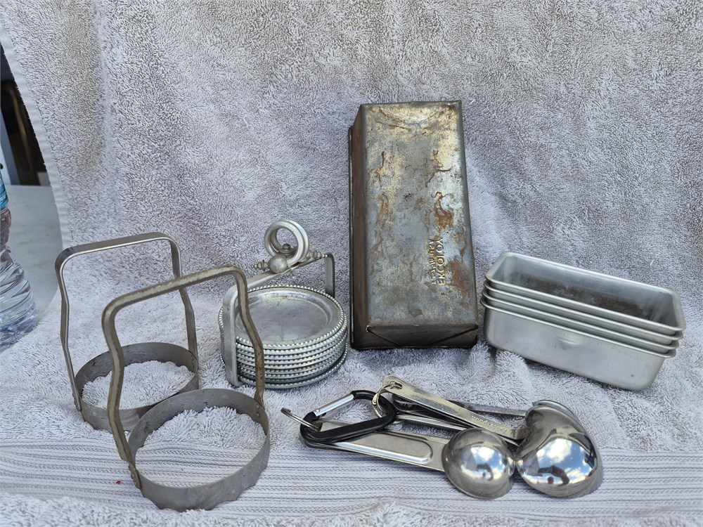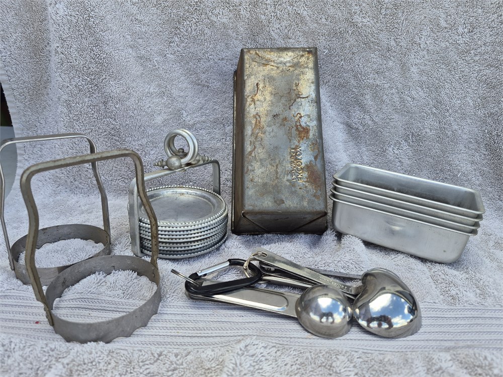 Vintage lot of kitchen accessories. Includes baking pans, measuring spoons, biscuits Cutters and coasters set.