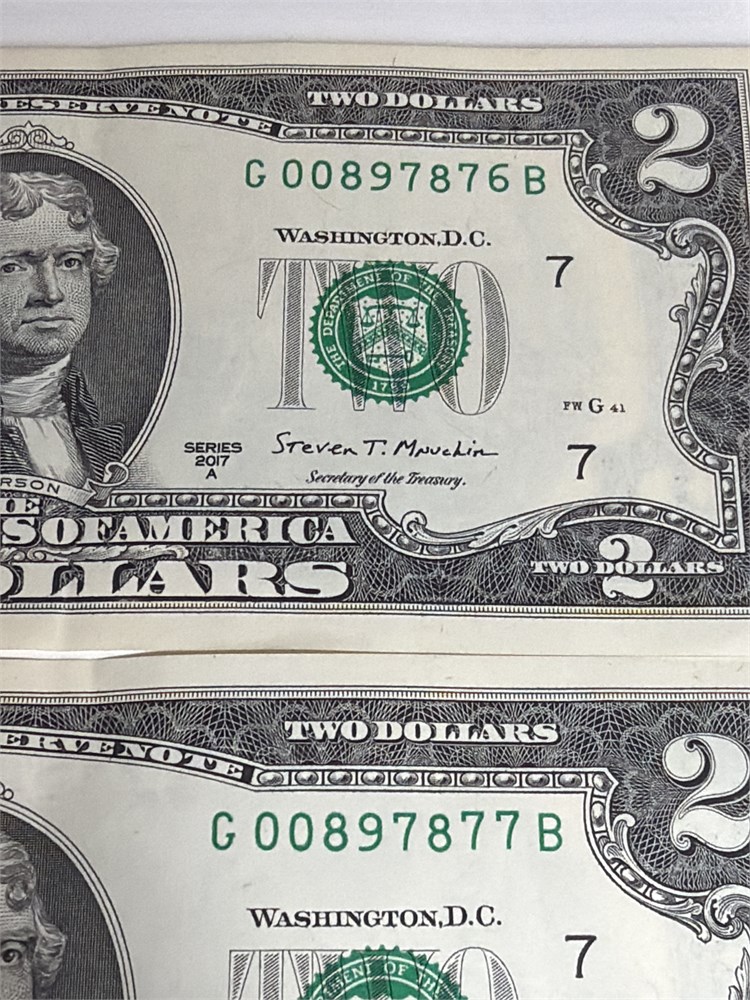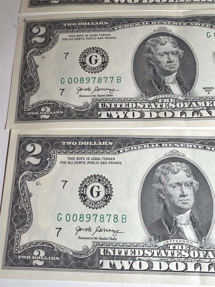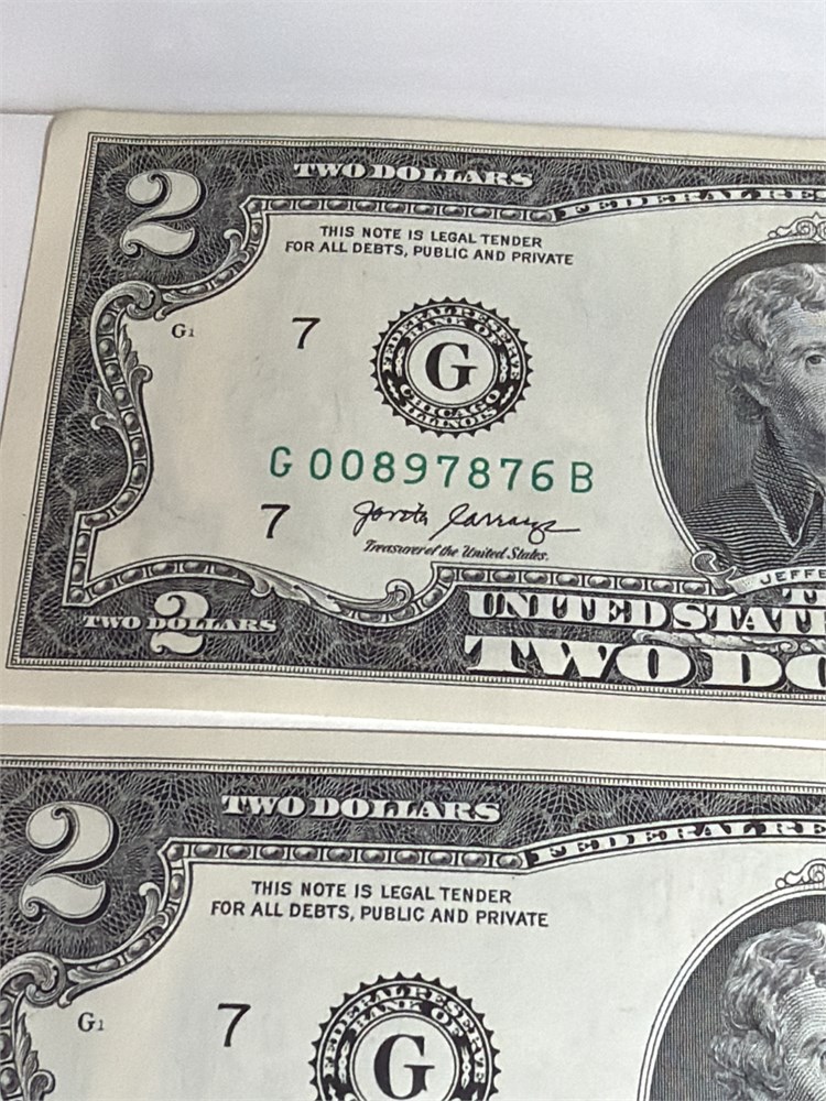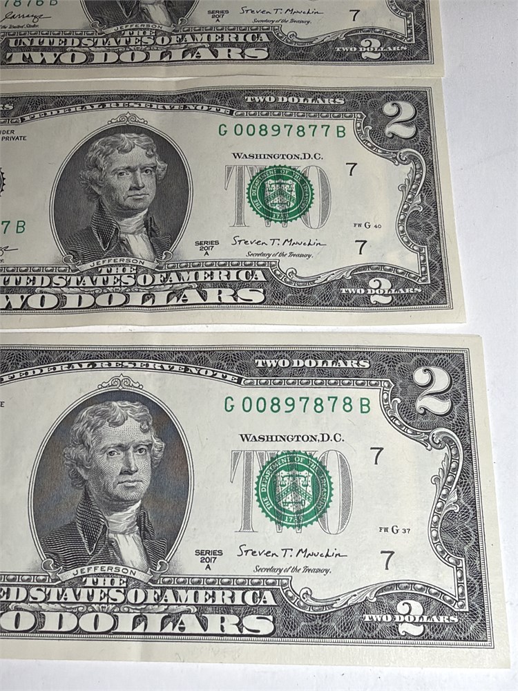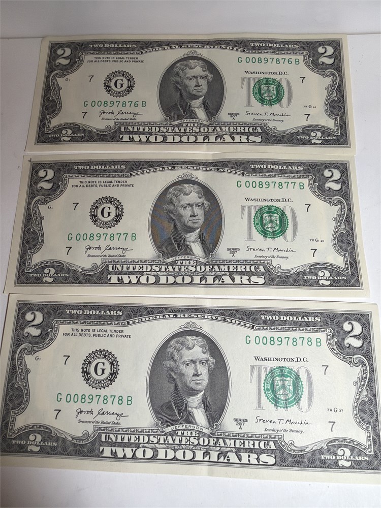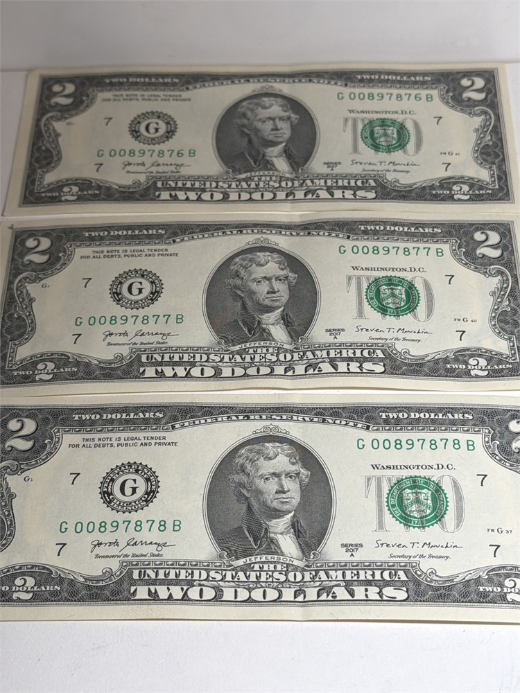 Rare Consecutive Serial Number Set - 3 Matching $2 Bills(L)