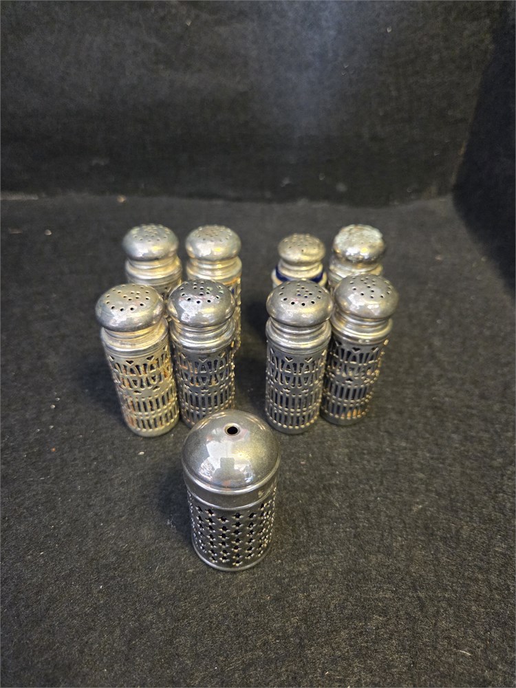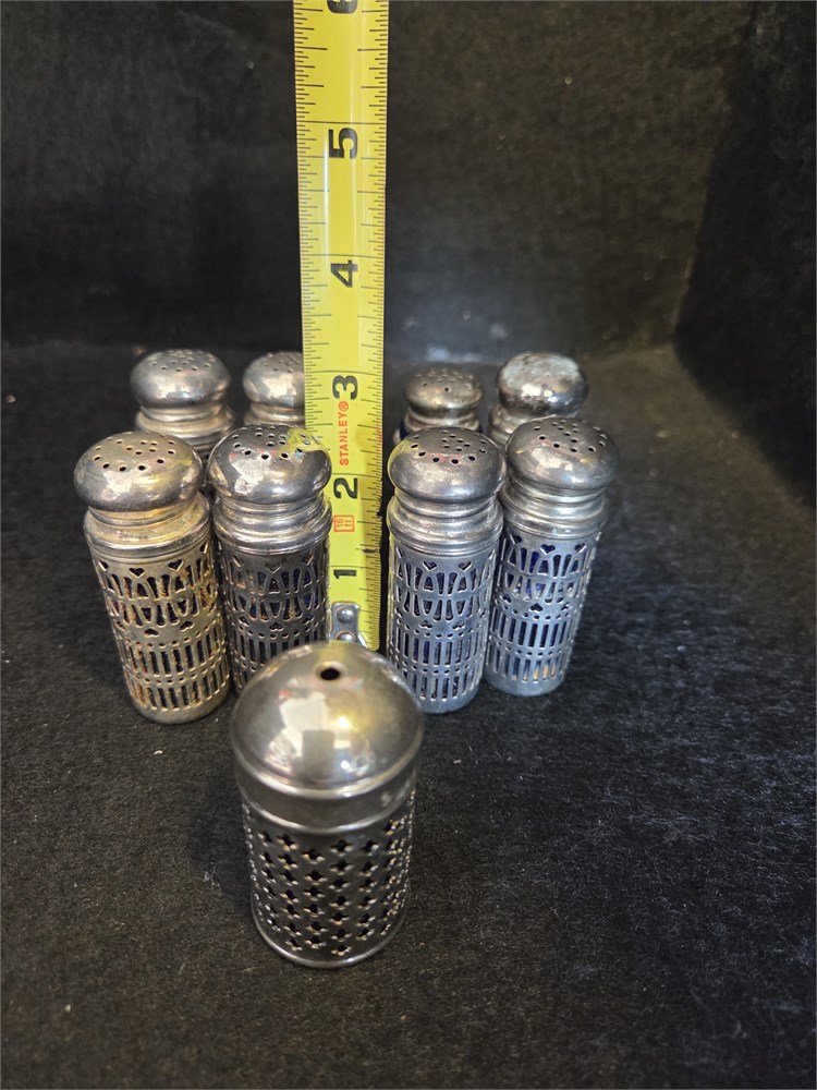 8 salt and pepper shakers, silver/silver plate? and one toothpick holder. Not 100% sure if these are silver or silver plate, only one is marked silverplate.