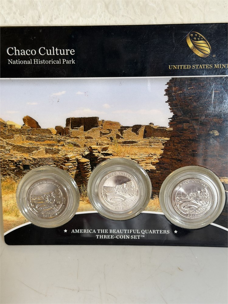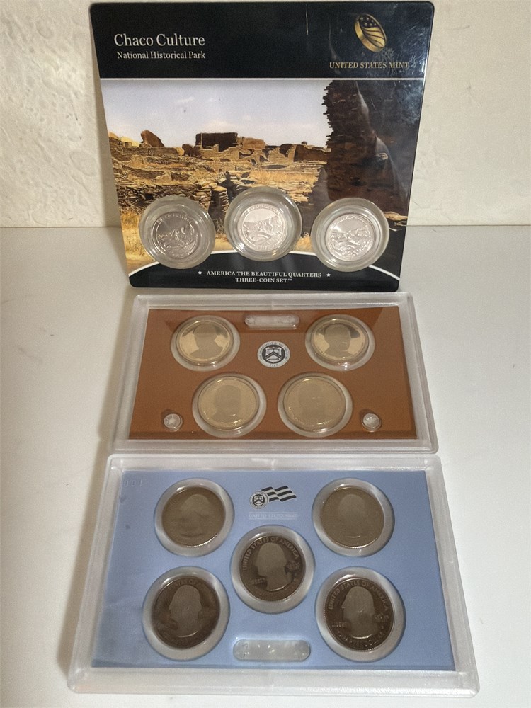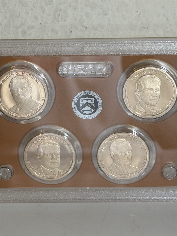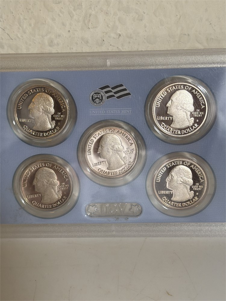 US Mint Proof Set, In Original Packaging Presidential dollars Gold plated, who played hot spring, Yellowstone, Mount Hood, Grand Canyon, American the beautiful quarter three coins also all uncirculated