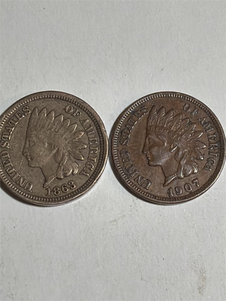 Two very rare great condition Indian head pennies, 1863 and 1907