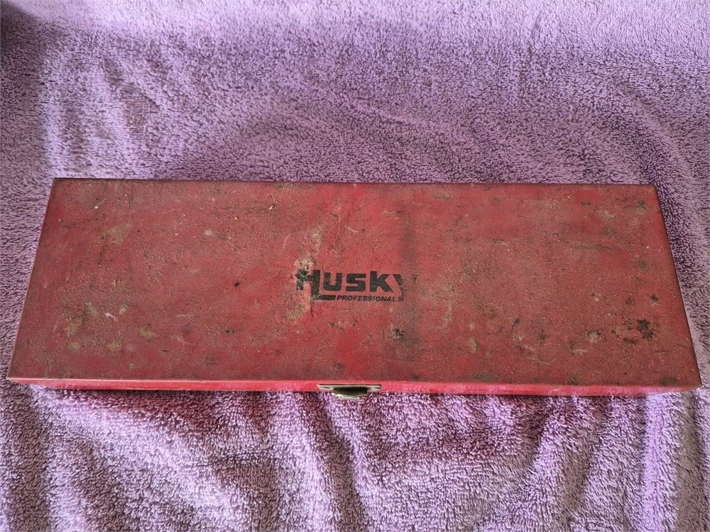 Husky tool box full of taps. Box measures 14"x 5" x 1.5"