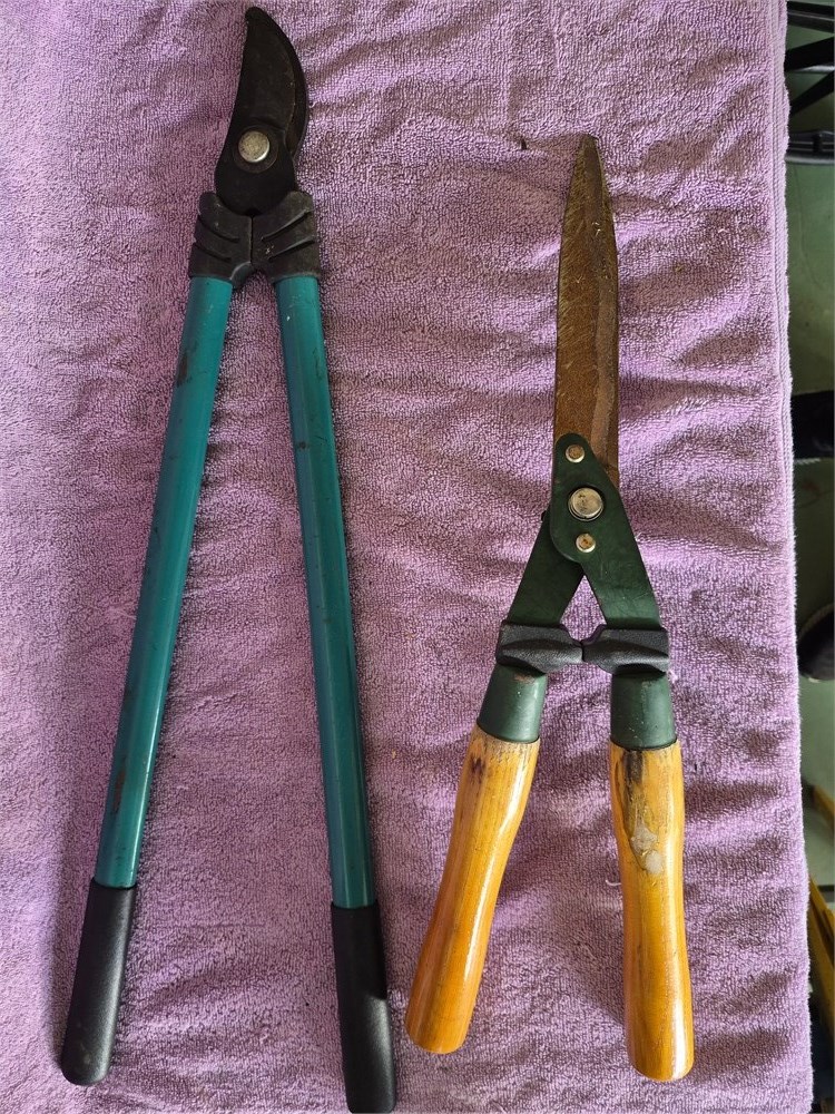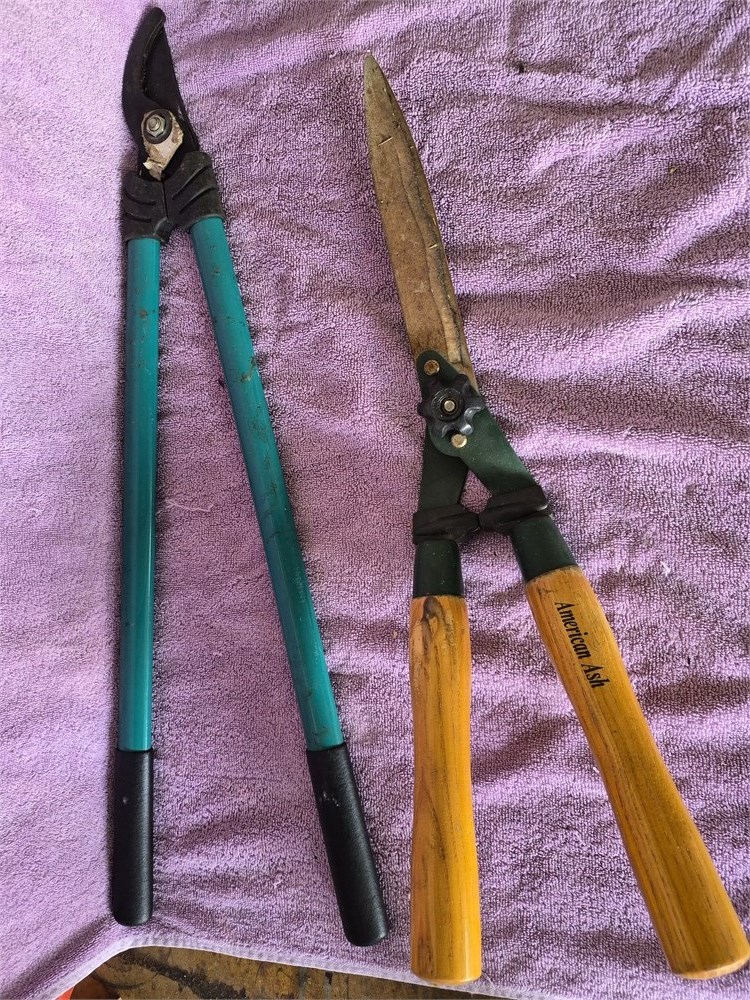 Pair of tree prunes and hedge trimmer.