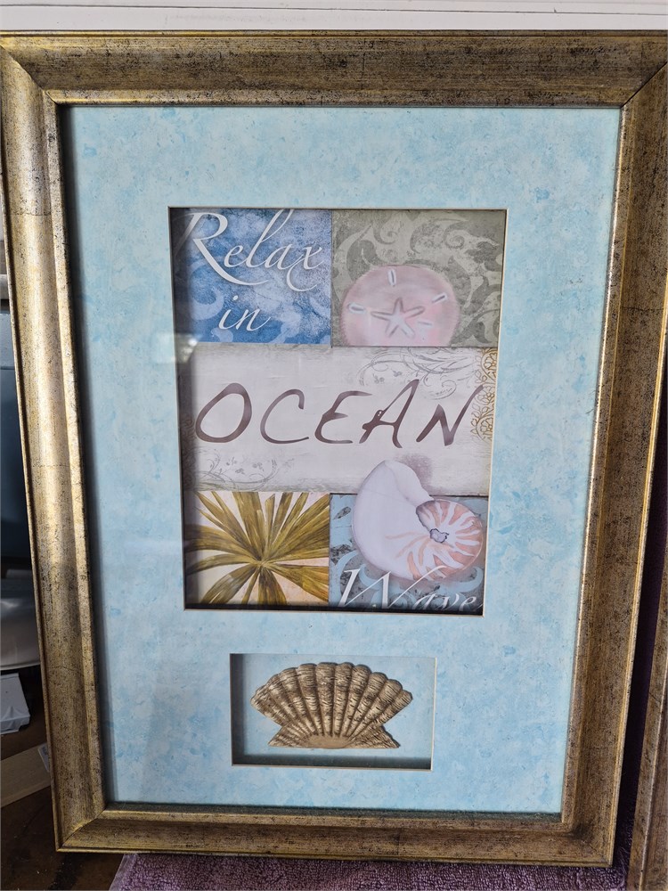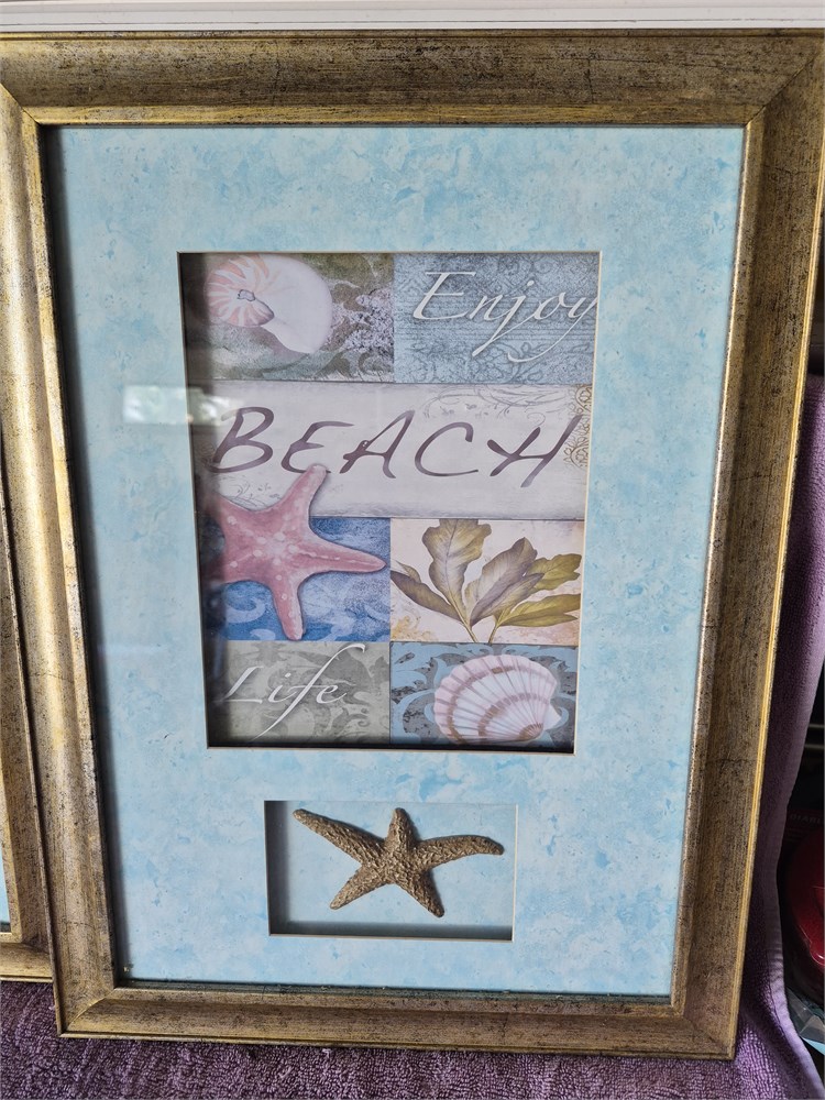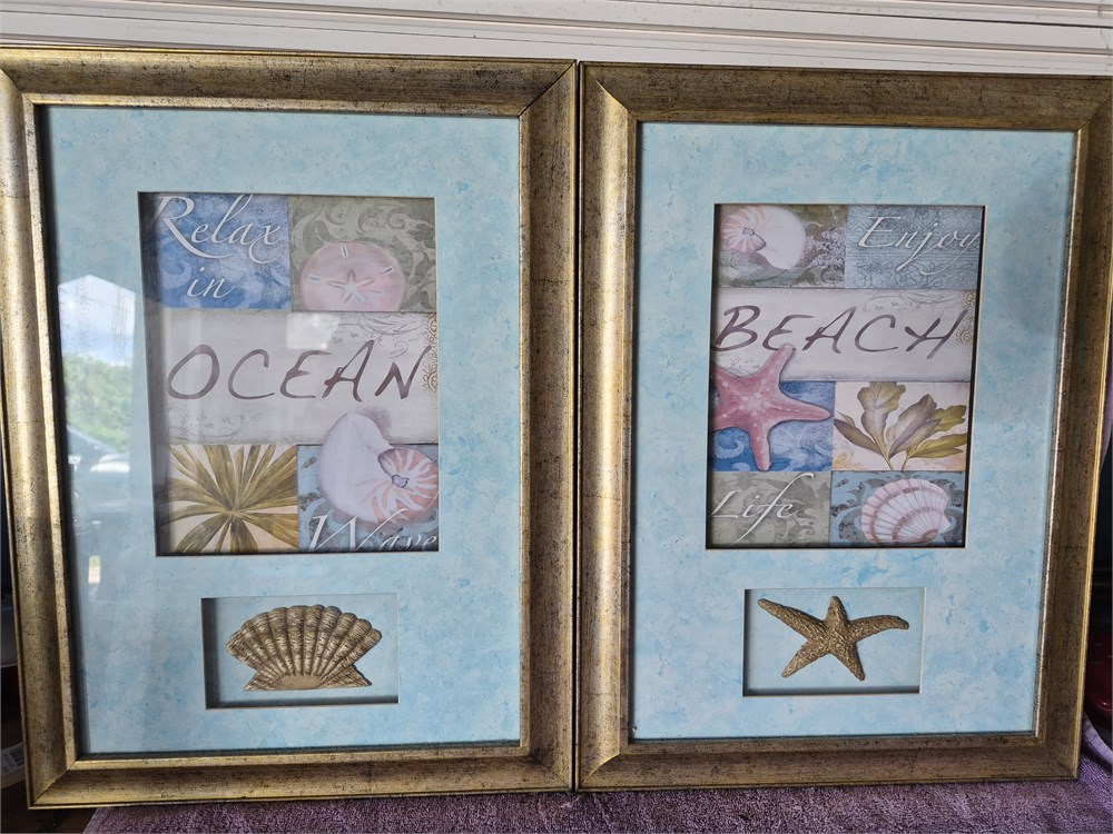 Two Framed beach themed pictures. Each measures 14" x 19.5"