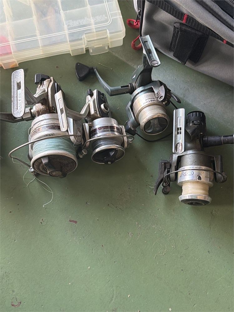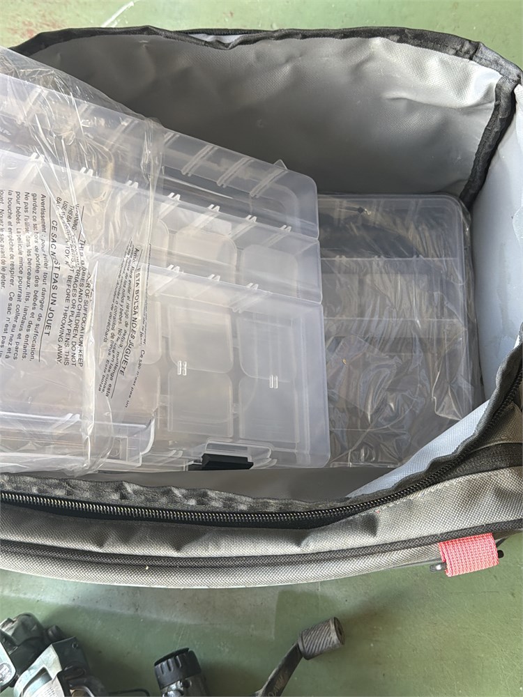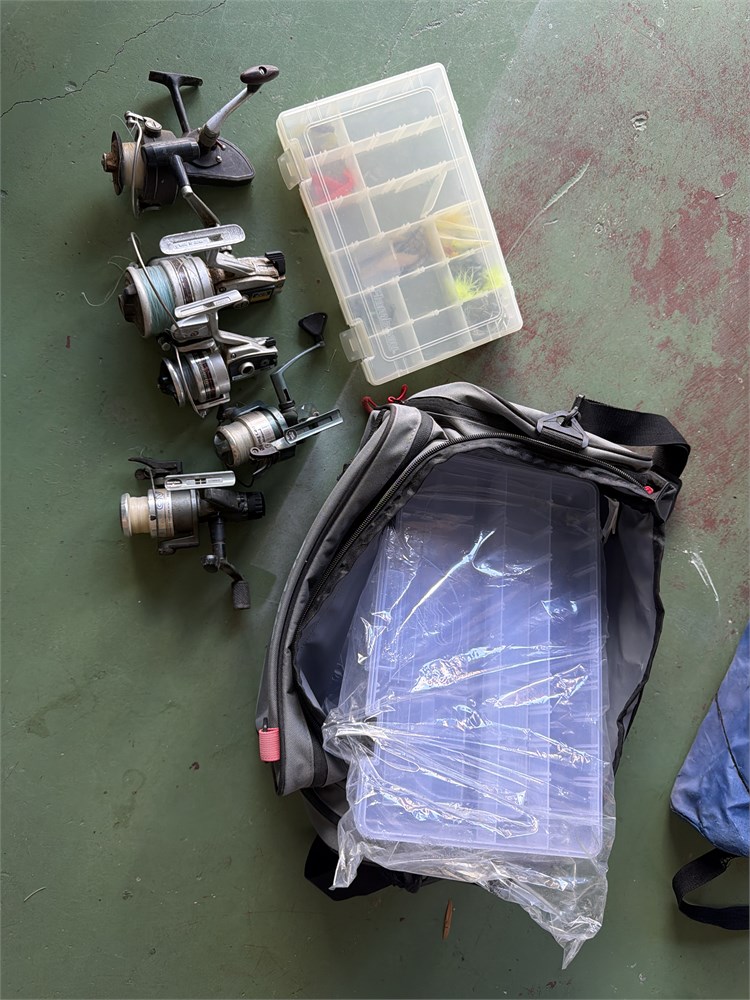 Brand new fishing bag with two Containers one container has a little bit of fishing equipment in it. We have five fishing reels.
