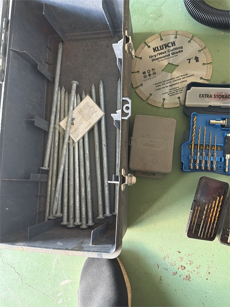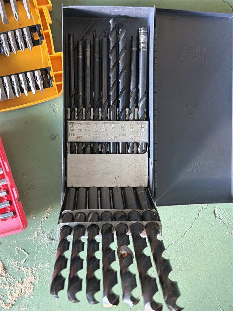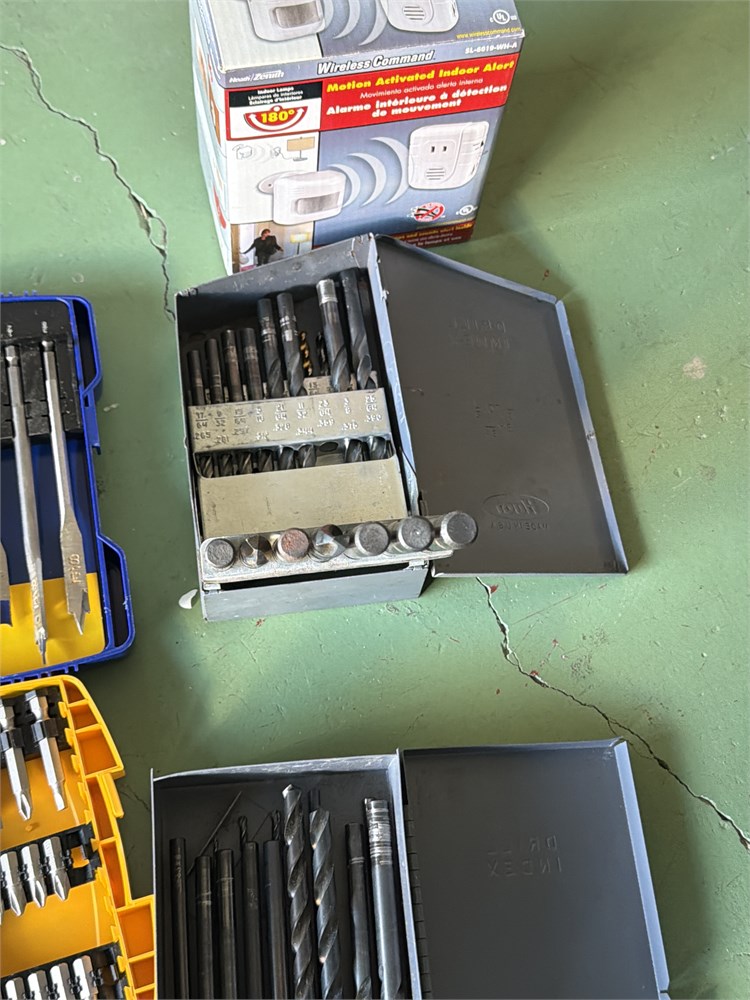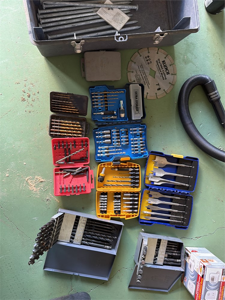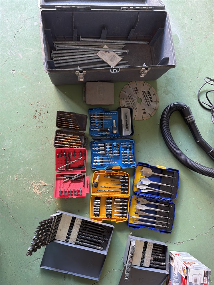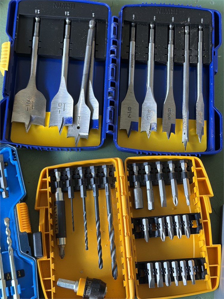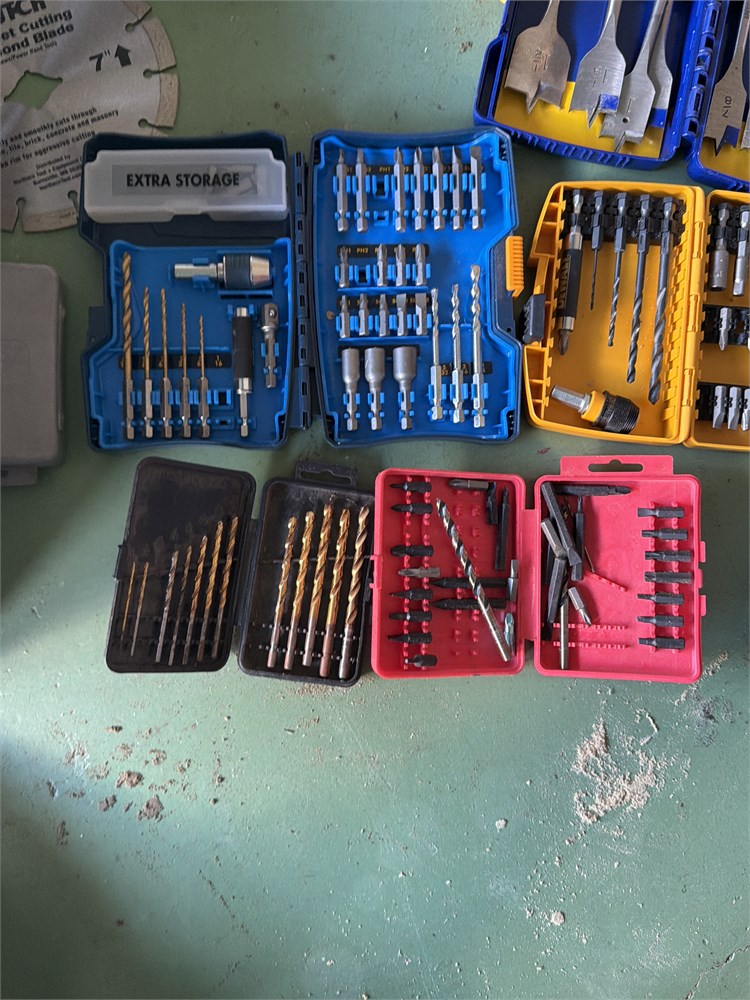 Drill bitch screwdriver bits, huge assortment, eight boxes full one circular 7 inch blade