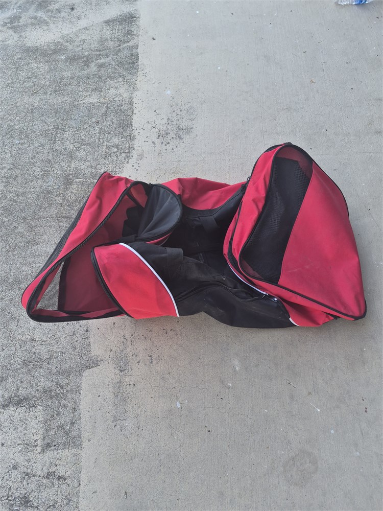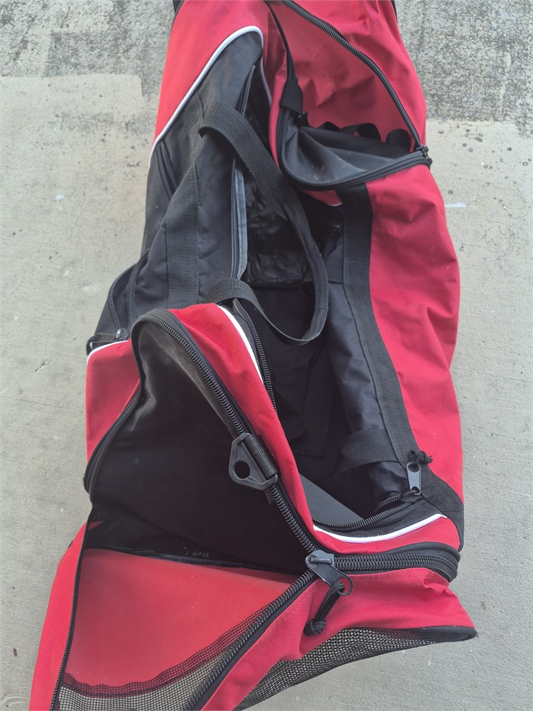 Nice, large redden, black, duffel bag, zippers, work.Everything looks to be in good used condition.