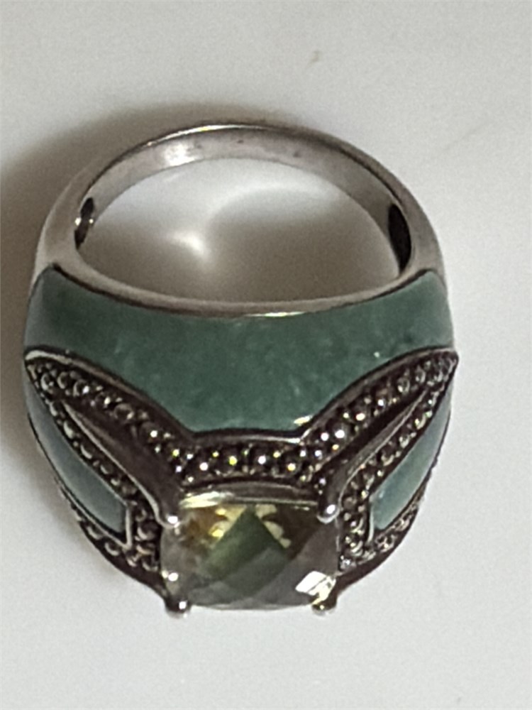 Marcasite Sterling Silver Ring Green stone in the center